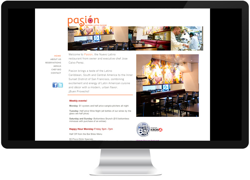 Pasion Restaurant Pasion is a Latin American cuisine restaurant in the Inner Sunset District. The website is designed to showcase there exquisite menu and decor with a modern urban flavor. See it live